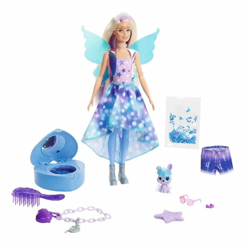 - Fantasy-mote-fairy Barbie dukken kommer med 2 komplette utseende som inkluderer en topp, skjørt, shorts, sko og ekstra eventyr-tema tilbehør, som eventyrkroner til både dukke og kjæledyr, solbriller, en vest med eventyrvinger og mer!