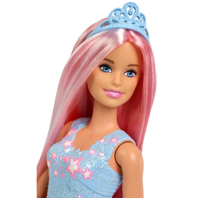 Barbie Dreamtopia dukke med langt rosa hår og glitrende rosa og turkis kjole med regnbue motiv. Børst håret til Barbie med den matchende rosa børsten som følger med og style håret hennes med flotte frisyrer.