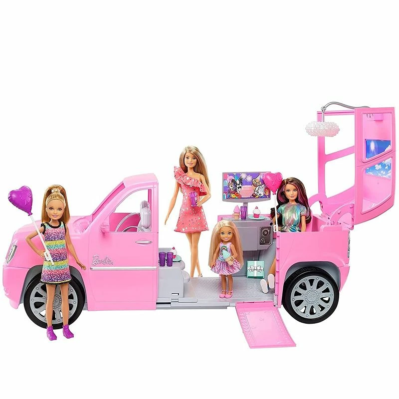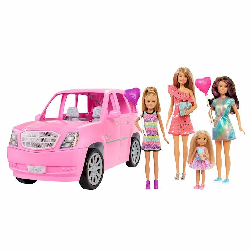 Barbie og alle tre søstrene hennes er klare til å feire en spesiell anledning i sin Party Limo! – men dette er ingen vanlig limo. Det er en rosa limo i SUV-stil som utvides til 60 cm lang og åpnes for å avsløre et festklart interiør! Bare åpne toppen og sidene og dra for å transformere. Det er til og med en lysekrone! Festtilbehør som hjelper dem med å feire begivenheter, for eksempel bursdag, inkluderer hjerteformede ballonger, cupcakes og iskrem, drikkekopper og en gave. Når det er tid for å gå videre, låser du bilen for å kjøre de fire søstrene til deres neste destinasjon. Anbefalt alder: 3+