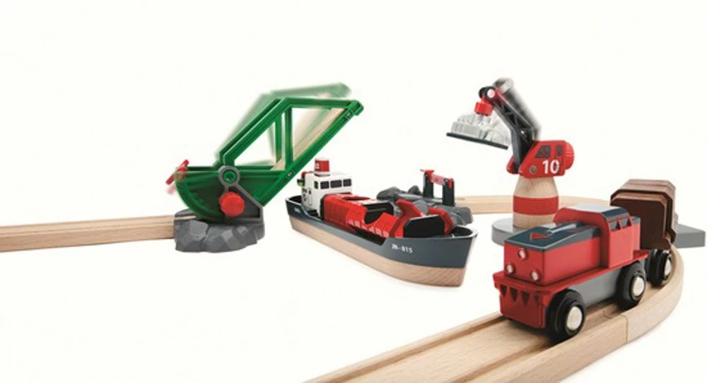 Settet innholder: Batteri drevet lokomotiv med lastevogn, lastebåt, bro som kan åpnes manuelt og lastekran med magnet til å heise varene fra toget, samt togskinner i tre. Container skipet seiler over vannet og ankommer havnen med sin last. Det batteri drevne toget venter på å bli lastet ved hjelp av den multi funksjonelle kranen. Skyv opp dørene til godsvognen og putt lasten inni for sikker levering. Når skipet forlater havnen, ikke glem å åpne broen slik at det kan passere på sporene.