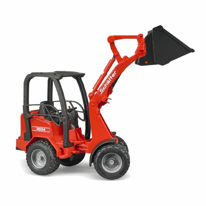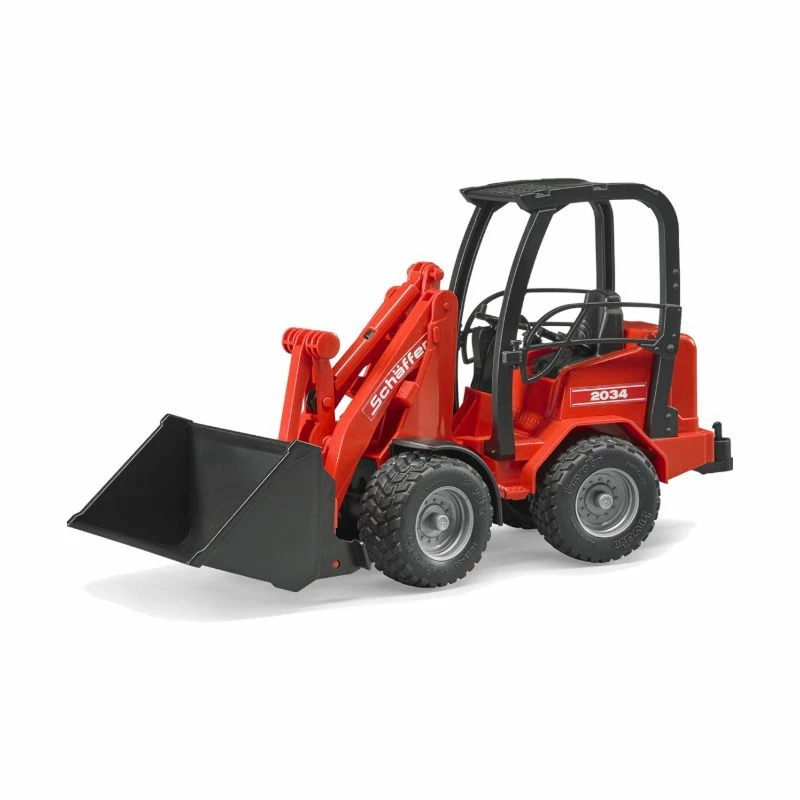 I over 50 år har Schäffer utviklet leddstyrte veilastere for landbruks-, landskaps- og hagebruksformål. Den kompakte serien 2000 er en av Schäffers mest suksessrike modellserier gjennom tidene. Maksimal ytelse i trange rom, det er denne lasterens maksimum. Dette sentrale og overbevisende allsidige kjøretøyet som muliggjør suksess i landbruket er nå lagt til Bruder-kolleksjonen i en skala på 1:16. Kjøretøyet har operativ leddstyring og lastearmen samt skuffen betjenes også akkurat som i originalen. Solide krengebøyler beskytter bworld-figuren som passer komfortabelt inn i førersetet. Tilbehørsett 02318 kan festes til lasteren for å forbedre den lekne opplevelsen.