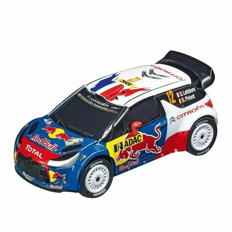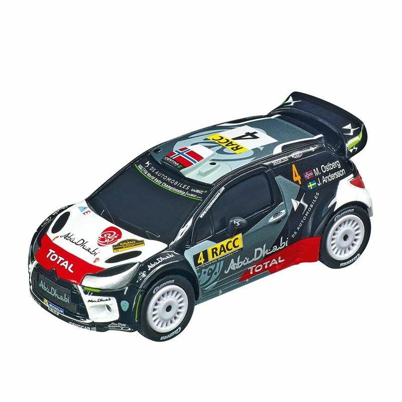 Slik at du også kan bli kjent med attraksjonen til de glatte rallyløpene, tilbys denne bilbanen fra Carrera GO!!! Den 4,9 meter lange banen i skala 1:43 gir deg følelsen av å være hjemme. De to racerbilene Citroën DS3 WRC i en skala på 1:43 skiller seg ut på grunn av lakkeringen. Baneelementene med rette og smale partier i et spesielt rallydesign gir ytterligere sofistikerte elementer til racerbanen din. Ved å trykke på turboknappen på kontrolleren kan du virkelig tråkke på gassen – spesielt i looping-delen. I tillegg til racerbanen, de to spilleautomatene og de to hastighetsregulatorene, inkluderer settet også en transformator, en rundeteller og tilbehøret til banen.