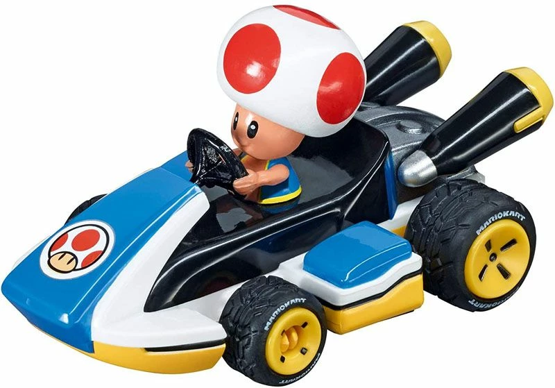 Stilig opptrekkbar Toad bil fra Carrera Mario Kart serien! Trekk bilen bakover og slipp taket for å se at den suser fremover av seg selv.