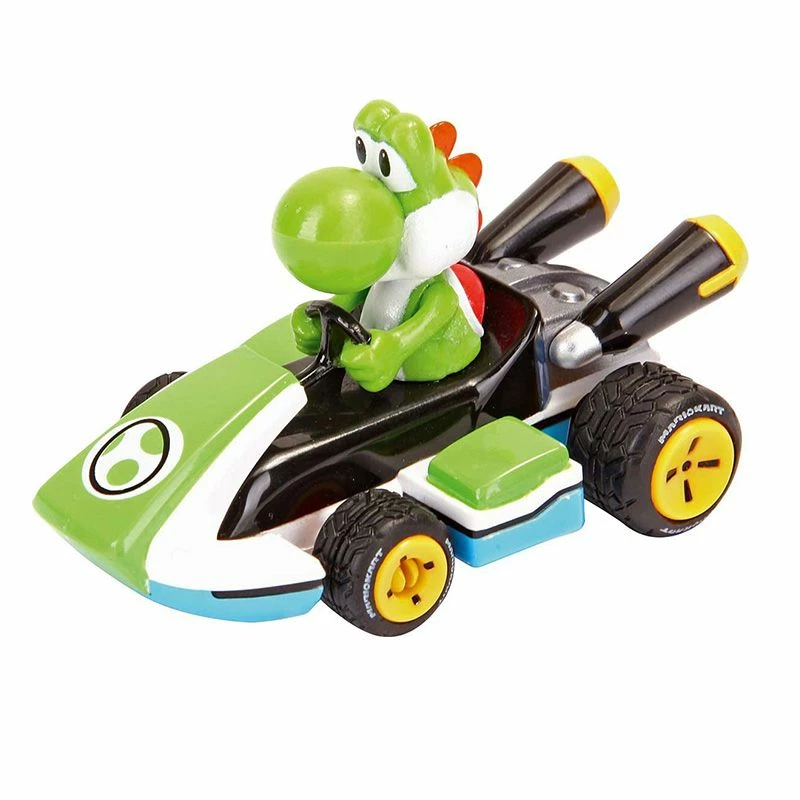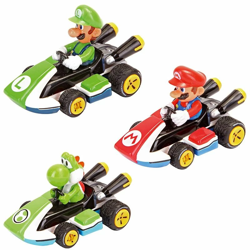 Press ned, trekk tilbake og slipp! Carrera Pull & Speed biler er lynraske og morsomme for både barn og voksne! Bilene har autentisk design og er svært detaljerte biler som gir høyhastighets moro på alle underlag. Pakken inneholder 3 biler med Mario, Luigi og Yoshi, som alle måler ca 7cm.