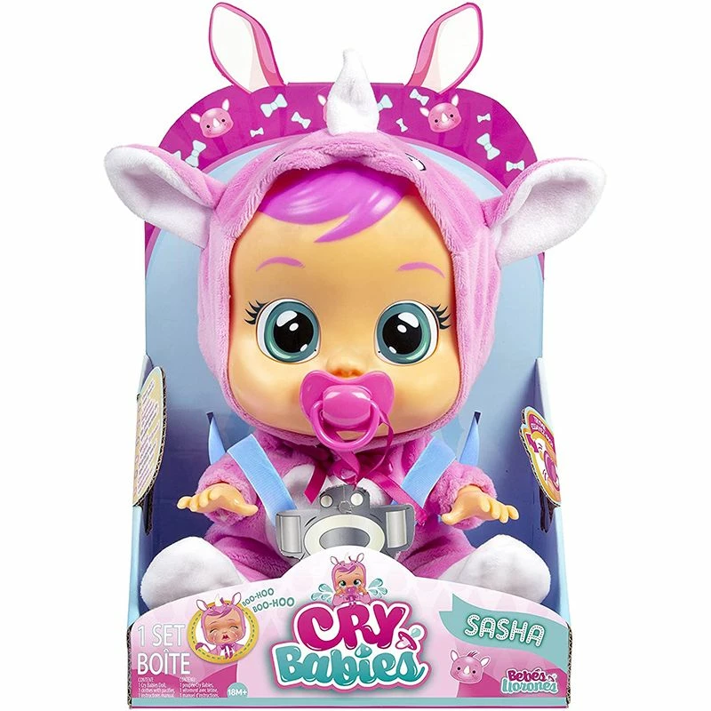 Møt Cry Babies Sasha, hun er en baby som har på seg en nydelig rosa og hvit neshornpysjamas! Hun er veldig søt, men … hun gråter ekte tårer når du tar ut smokken hennes! Sett smokken inn igjen, ellers vil hun ikke slutte å gråte, og hun vil gråte enda høyere. Du kan også legge henne ned for å roe henne. Gi henne masse kos og legg henne ned for å hindre henne i å gråte. Sasha oppfordrer barna til å delta i morsom fantasifull lek! Neshornpysjamasen kan enkelt tas av og på slik at antrekket hennes kan byttes med andre klær fra Cry Babies serien.