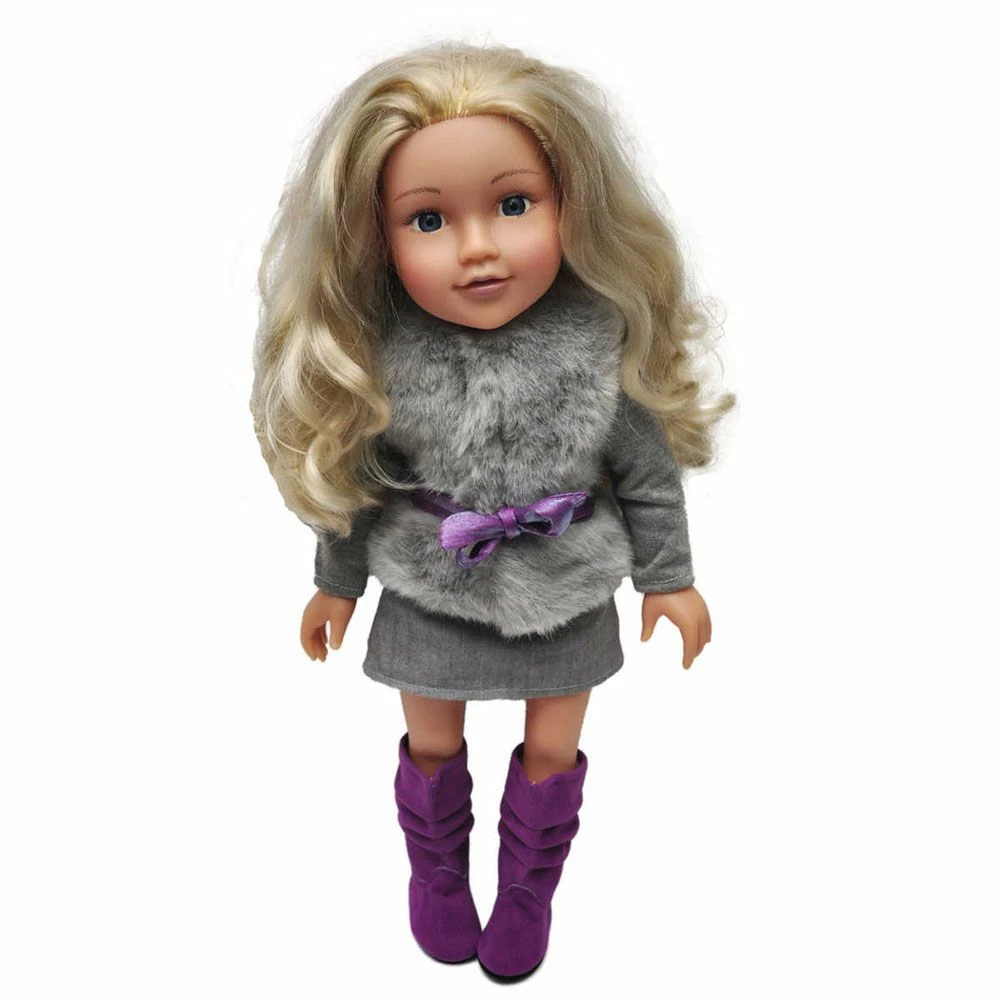 Dette er den søte dukken Aimee fra DesignaFriend. Aimee har mykt, langt hår som er perfekt til å børstes og settes opp i ulike frisyrer, og hun har på seg en fin outfit bestående av en vest i fuskepels med sløyfe, bomullskjørt og knehøye syntetmoccastøvler. Med hver dukke følger det med et flott anhengsarmbånd. Dukken kommer i en flott skoeskeformet gavepakke med silkepapir. Dukken måler 45 cm