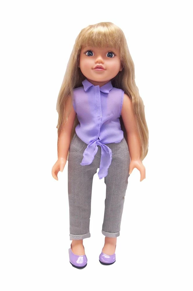 Carly har på seg grå bukser og en lett sommertopp. På føttene har hun lilla ballerinasko. Dukken kommer levert i en flott designet eske, og med i esken finner du et designafriend armbånd. Dukken er ca 46 cm høy og har langt mykt hår. Passer fra 6 år+