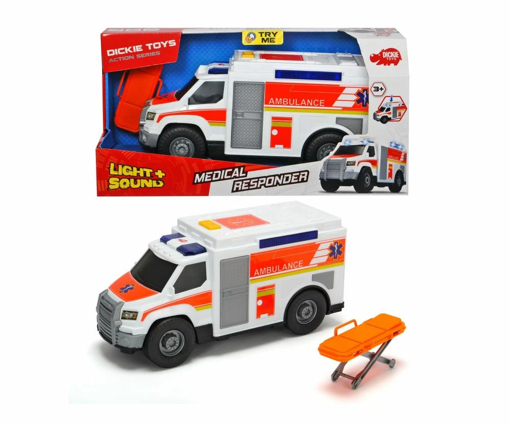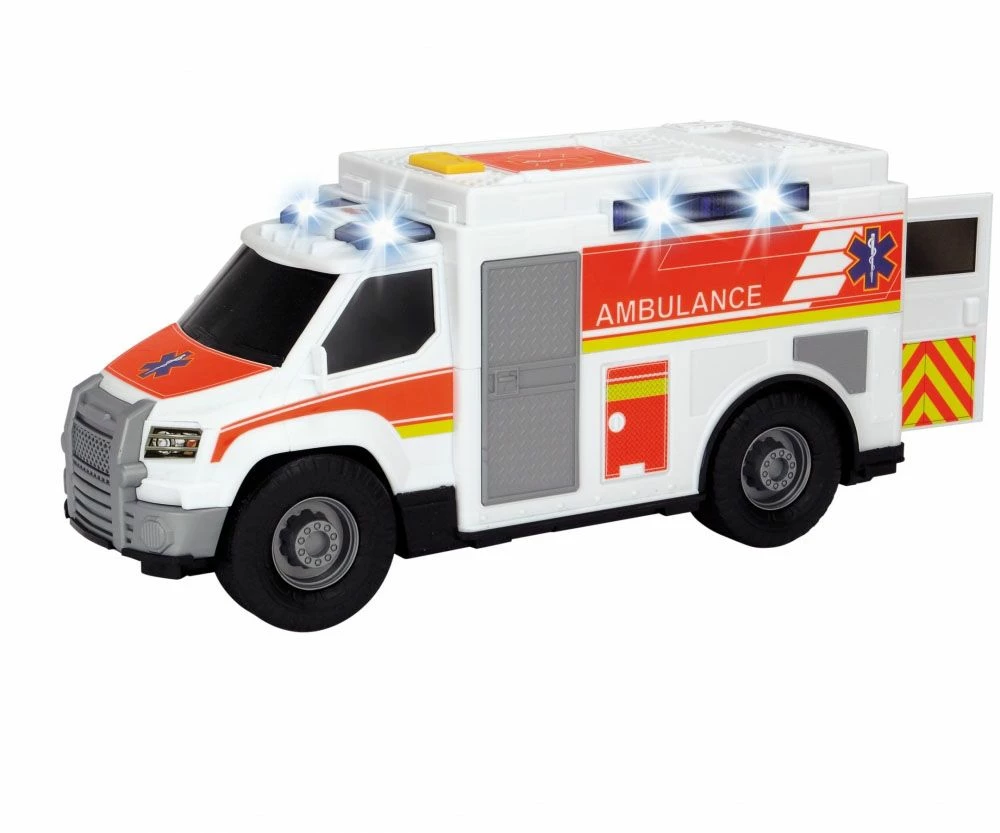 Stor ambulanse med lyd og lys fra Dickie Toys. Bakluken kan åpnes og gir plass til båren. Ambulansen måler ca. 30 cm i lengde og batterier er inkludert. Anbefalt alder fra 3 år.