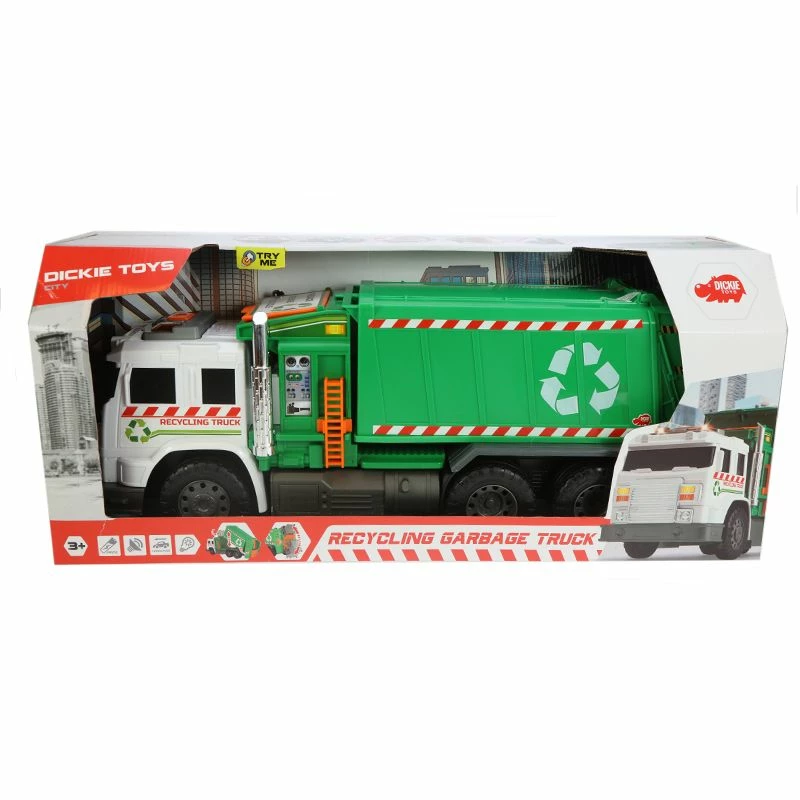 Med denne stilige søppelbilen fra Dickie Toys har det aldri vært enklere å holde gatene i byen din rene. Fest søppeldunken bak på søppelbilen og vri på den oransje knappen for å tømme båsset. Søppelbilen har et lasteplan som kan heves og senkes og bakdøren kan åpnes og lukkes. Trykk på knappen på taket til bilen for å spille av realistiske lydeffekter og se at lysene på bilen blinker.