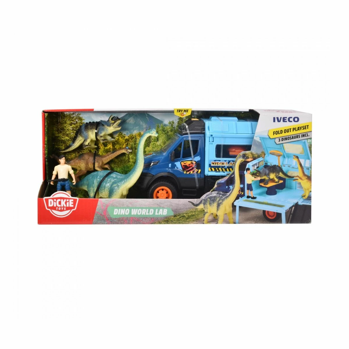 Undersøk dinosaurer med Dino Laboratory fra Dickie Toys! Settet inkluderer en offisielt lisensiert lekebil fra Iveco og er en flott gave til små bilsamlere som ønsker å finne ut mer om dinosaurenes verden. Iveco Daily 4×4 terrengbil kan gjøres om til et fullt utstyrt laboratorium for å kunne inspisere dinosaurer. Bilen har lys- og lydeffekter som enkelt kan aktiveres ved å trykke på en knapp og bidra til å stimulere barns fantasi. Dørene kan åpnes og lukkes, slik at du kan lagre litt tilbehør inne i kjøretøyet. I tillegg til bilen inneholder settet tre dinosaurer og en bøyelig figur. Lengde: 25 cm. Dickie Toys Dino Laboratory lekesett passer barn fra 3 år. Batterier inkludert (1xAAA).