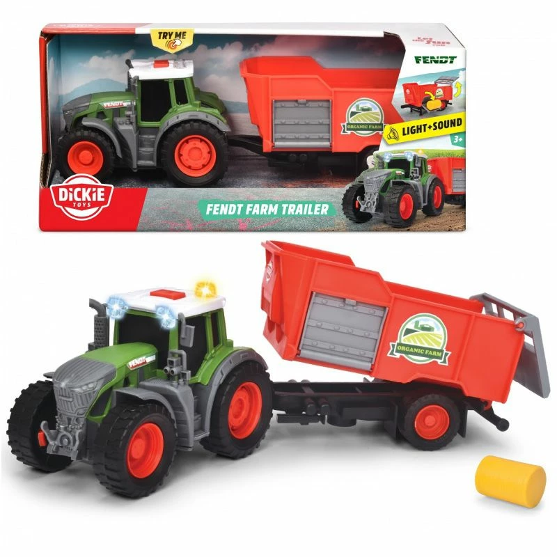 Gå på jobb på gården med Fendt traktor med henger fra Dickie Toys! Denne traktoren med stor tilhenger er et must på enhver gård. Den har en offisiell Fendt-lisens og er en perfekt gave til alle fans av traktorer. Den elegante traktoren har friske, lyse farger, detaljert design og en rekke morsomme og underholdende funksjoner. Den har inkluderer lys- og lydeffekter og roterende hjul, samt hengerens vippefunksjon, klaffer til å folde ut og oppbevaring for den medfølgende høyballen. Store, brede dekk gir rikelig med grep og sørger for at traktoren ikke kommer ut av kurs. Batterier inkludert (2xAAA). Fendt traktor med henger fra Dickie Toys er 26 cm lang og passer barn fra 3 år.