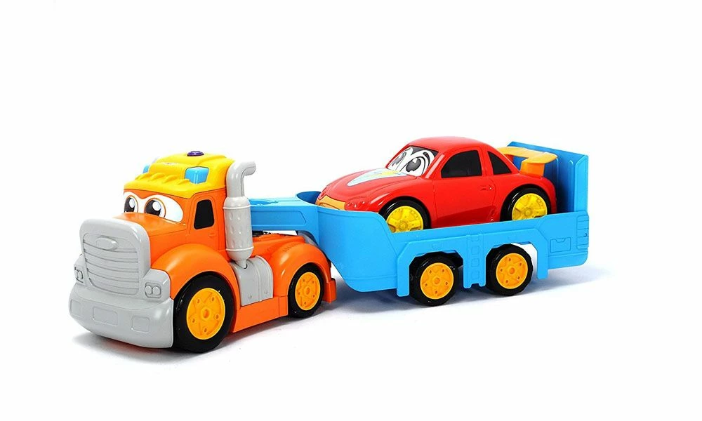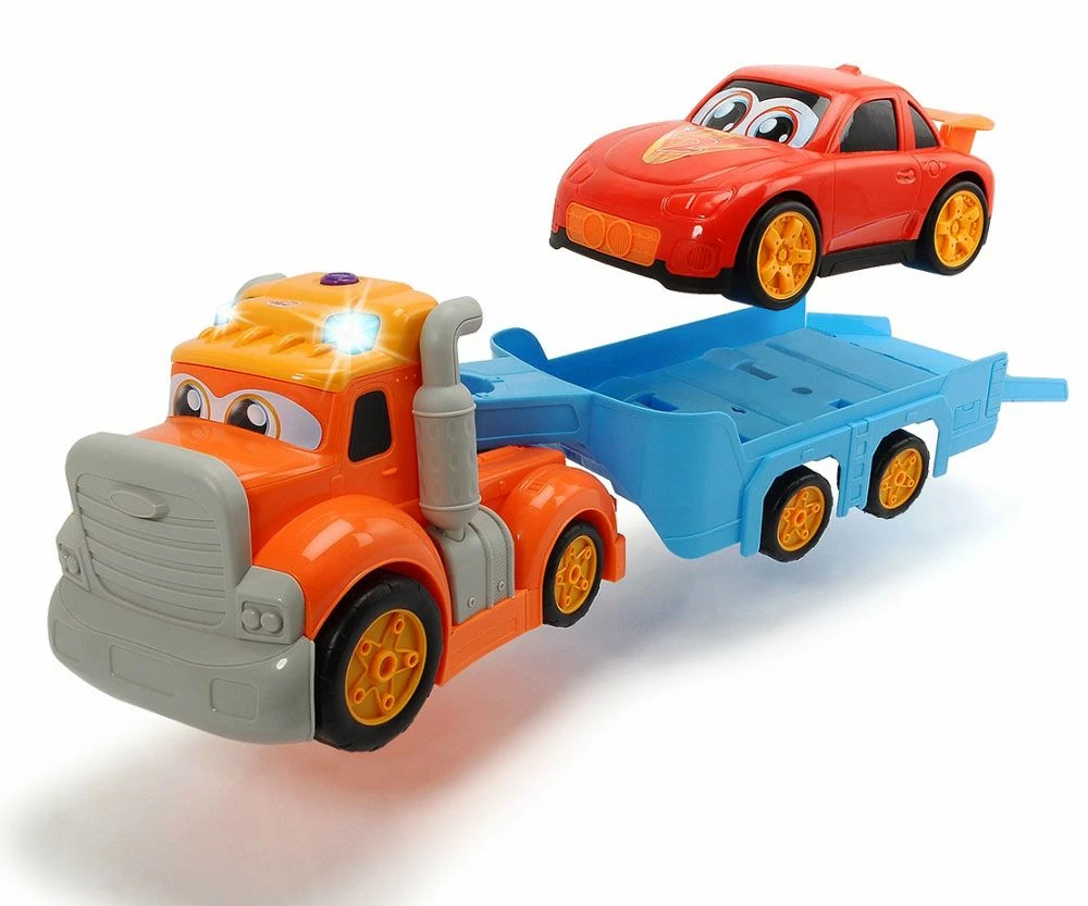Flott og stor biltransporter fra Dickie Toys. Slep bort de feilparkerte bilene! Alle deler er barnevennlig utformet med avrundede kanter og perfekt størrelse for små barnehender. Dens store øyne gir den et vennlig uttrykk. Leketøyet er laget i solid plast og tåler røff behandling. Tilhengeren kan bobles av lastebilen. Med lys og lyd blir leken enda morsommere! Total lengde er ca 60 cm. Krever 2 AA batterier (inkludert). Anbefalt alder fra 1 år.