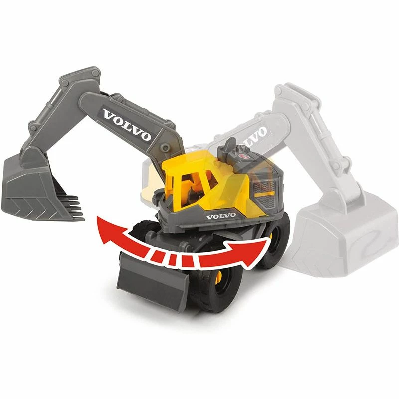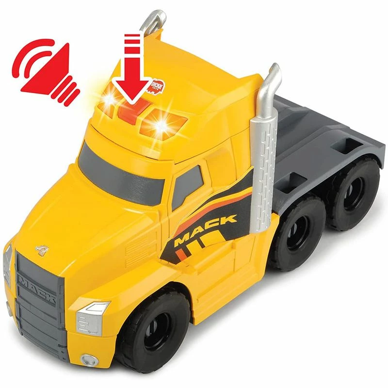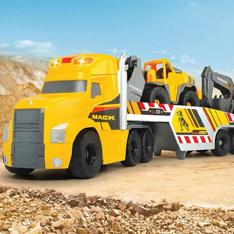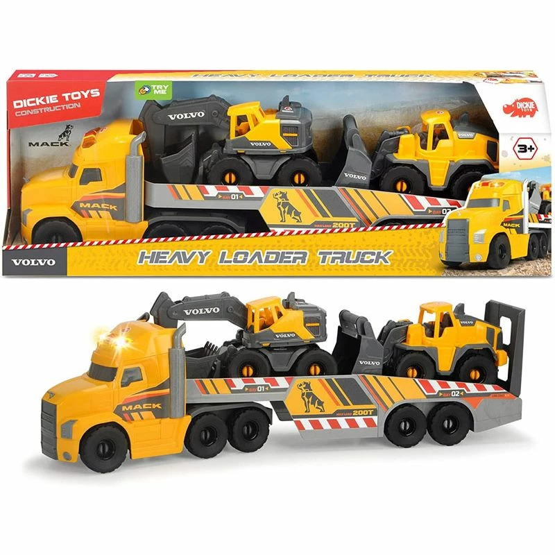 Dickie Toys Heavy Loader Truck: for spirende byggherrer. Dette Volvo-inspirerte leketøysettet fra Dickie Toys lar din lille lage sin egen fantasi byggeplass. Dickie Toys lastebilsettet inkluderer en stor Mack-lastebil med henger som laster Volvo gravemaskin og hjullaster. Gravearm på graver kan roteres og justeres og skuffen på hjullaster kan heves og senkes. I tillegg kan bakluken på lastebilen åpnes. Lastebilen har også morsom lyd og lys funksjon (batterier inkludert). Hengeren kan kobles fra lastebilen. Lekesettet passer for barn fra 3 år og oppover og er den perfekte introduksjonen til den spennende verden av anleggskjøretøy. Lastebil med henger er totalt ca. 70 cm lang. Graver og hjullaster er ca. 26 cm.