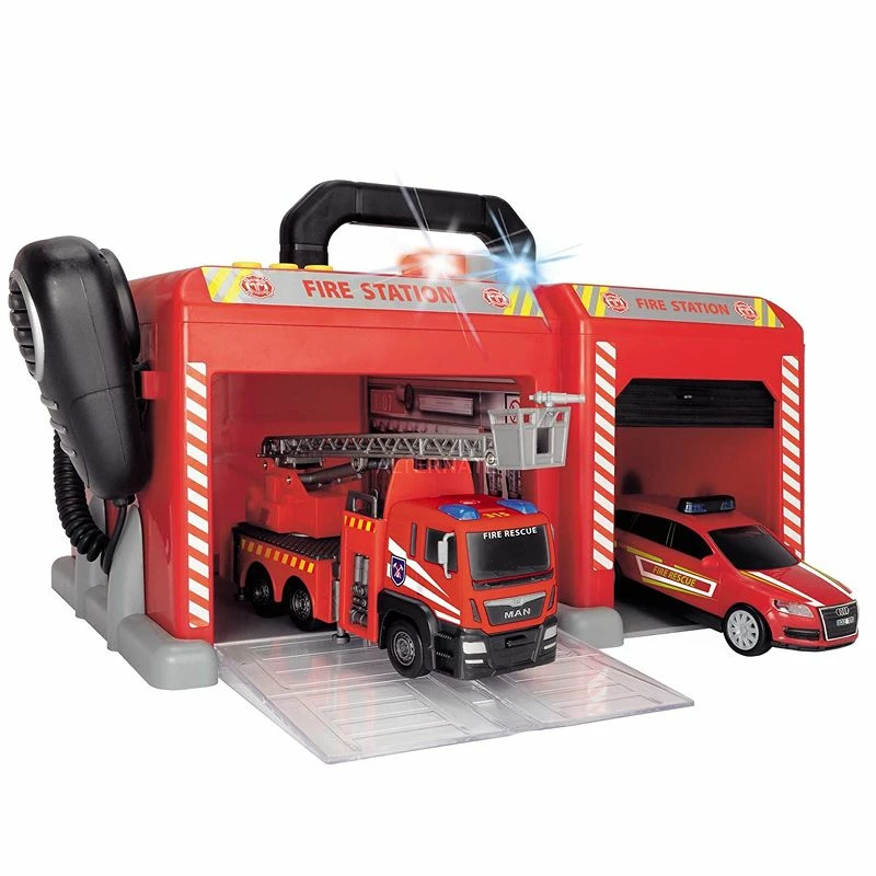 Brannstastjon med bærehåndtak, og innebygd lys og lyd. Stasjonen har to garasjer som inneholder en brannbil og en kommandobil. Brannbilen kan sprute vann. På siden av stasjonen er der en walkie talkie man kan snakke i.Benytter 3 stk AA batterier (inkl.) Passer fra 4 år+