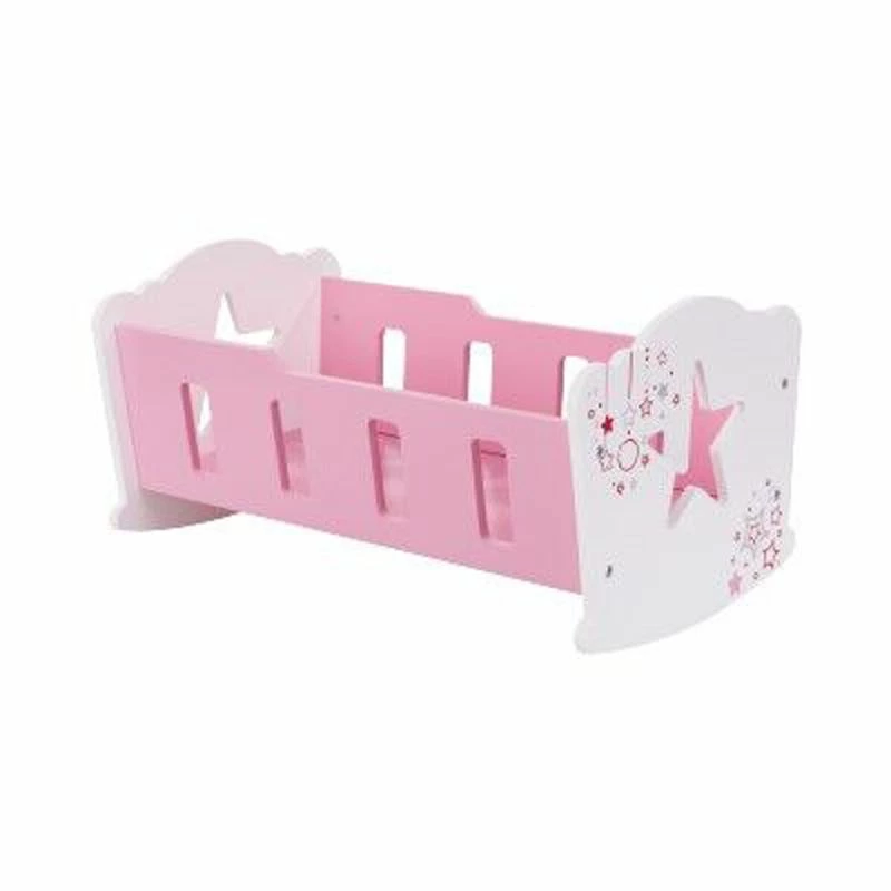 Søt liten vugge i tre til babydukken. Malt i rosa og hvit med stjerner. Den har stjerneform hull på kortsiden. Vugga passer til dukker opptil 43 cm. Anbefalt aldre fra 2 år.