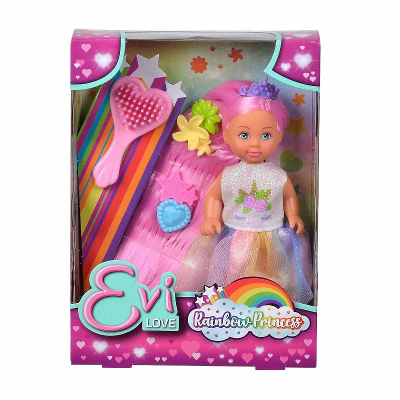 Den flotte prinsesse Evi er glad i alle regnbuens farger, noe som gjennspeiles i hennes fargerike og glitrende kjole! Evi har langt og flott rosa hår som kan børstes og styles slik at hun er klar til en hver annledning. Dekorer håret til Evi med de flotte hårklemmene i forskjellige farger og former.