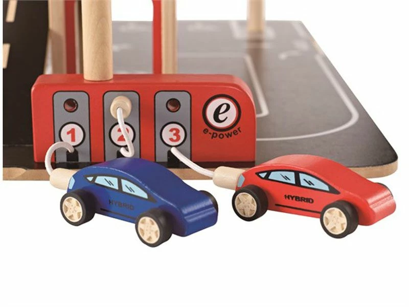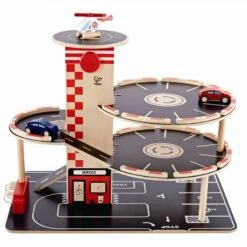 Det er nok av parkeringsplasser til både biler og helikopter i denne fire etasjers garasjen med service stasjon, bensinpumper og landingsplass for helikopter. Med i settet følger to kule biler og et helikopter. Garasjen er solid og alle deler er laget i tre.