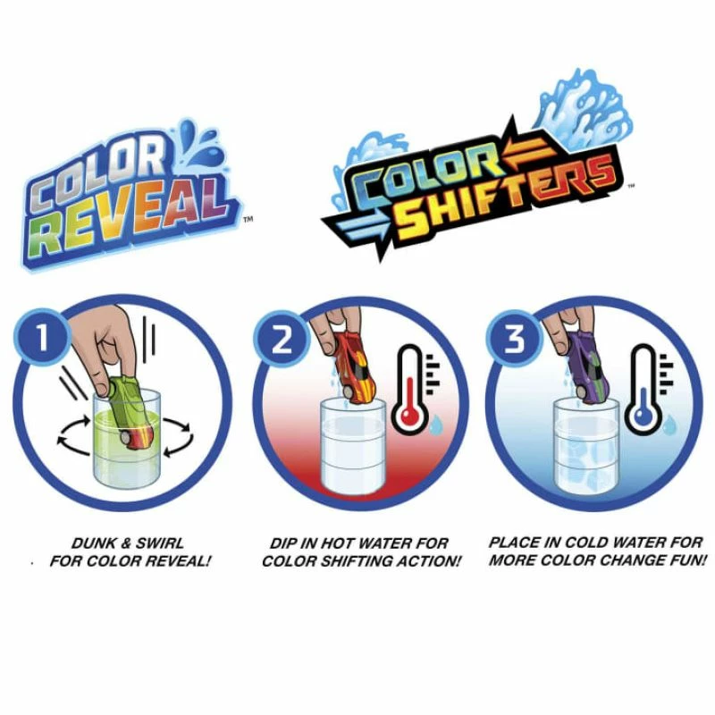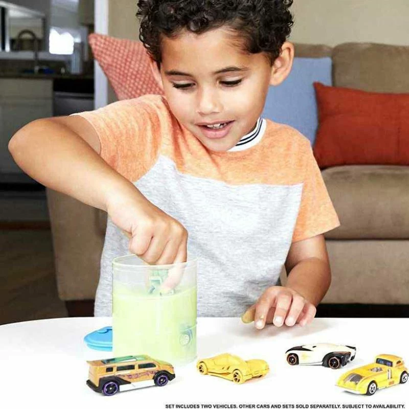 Hot Wheels Color Reveal 2-pakning med kjøretøyer fylt med fantastiske overraskelser. Tønnen inneholder to Hot Wheels Color Reveal-biler i skala 1:64 dekket av et spesielt Color Reveal-belegg. Fyll tønnen med vann, og sving hver bil rundt, inntil vannet skifter farge. Ta deretter ut bilen – de flotte dekorasjoner som er gjemt under belegget er nå blitt synlige.