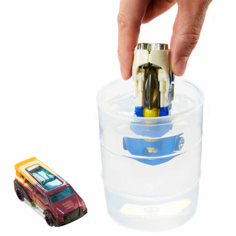 Vil du gjerne skifte uttryk på den igen? Fyll tønnen med kaldt vann, dypp bilene i vannet, og de forvandler seg igjen. Skift ennnå en gang uttryk ved å dyppe dem i varmt vann. Gjenta igjen og igjen, hvor du bytter på mellom varmt og kaldt vann. Som å ha to biler i én. Tønnen brukes som en Hot Wheels-tank, og den er også perfekt til oppbevaring.