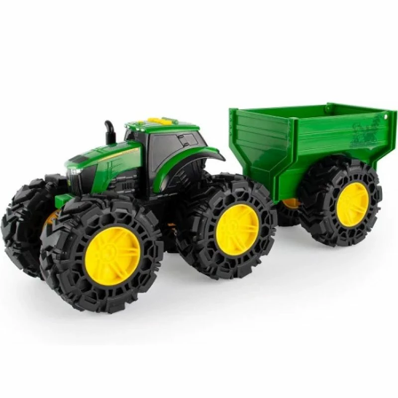 Monster Treads kombinerer realismen til John Deere med fantastisk monster kjøretøystyling for det beste fra to verdener! Denne John Deere leketraktoren med vogn har lys, lyder og supersprettende dekk for ekstra action og terrengeventyr! Ytterligere funksjoner inkluderer redesignede dekkmønster og en vogndør som kan åpnes. Den perfekte gaven til den yngre John Deere-fanen i livet ditt! Batterier inkludert slik at moroa kan starte med en gang.