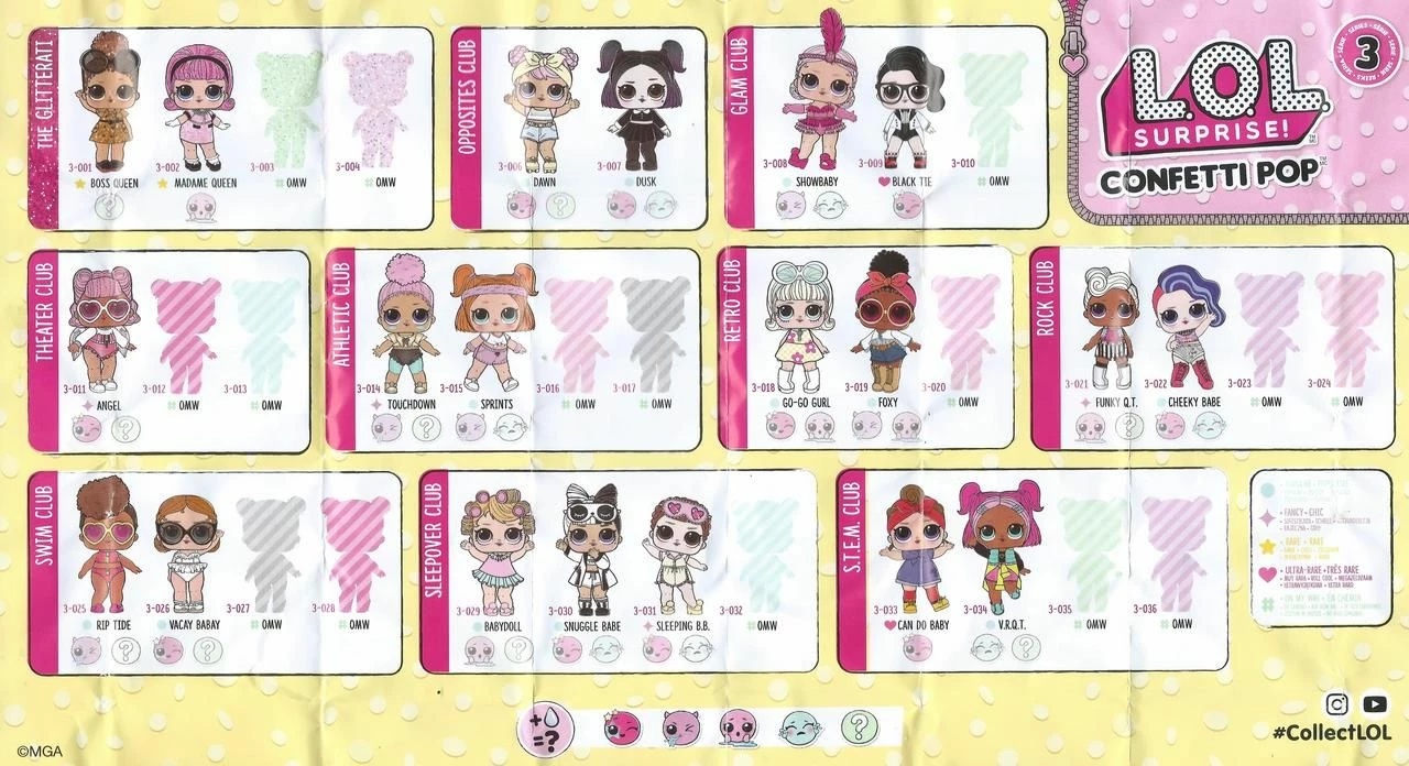 L.O.L. Surprise Confetti ballen inneholder hele 9 smÃ¥, spennende overraskelser. Etterhver som du Ã¥pner den vil du finne: – en hemmelig beskjed, klistremerke, flaske, et skopar, klesplagg, tilbehør, en ringtatovering, Confetti pop -tilbehør og en siste L.O.L overraskelse nÃ¥r du dypper den i vann! Dukken har en av tre ulike vannoverraskelser. Hver ball inneholder en hemmelig dukke, og det finnes 35 ulike varianter Ã¥ samle i Serie 3. Ballen mÃ¥ler ca. 10 cm i diameter. Passer fra 4 Ã¥r+