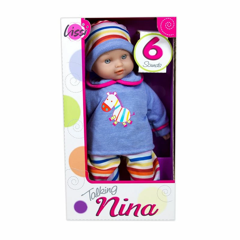 Søt liten Lissi dukke med myk kropp som lager lyd når du trykker på henne. Dukken måler ca 30 cm i lengde og er kledd i en søt genser med hestemotiv og stipete bukser med matchende hodeplagg. Trykk henne på magen og hun kan si mamma, pappa, gråte og le.