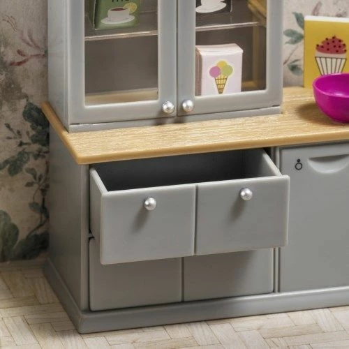 Stili retro kjøkkensett til Lundby huset med oppvaskmaskin, vask og masse skuffer og skap. Settet inneholder også diverse kjøkkentilbehør og det er lys i et av skapene. Krever 1 Cr 2032 batteri for å få lys (Batteri er ikke inkludert). Anbefalt alder fra 4 år. Settet har en 15 minutters autostopp inkludert