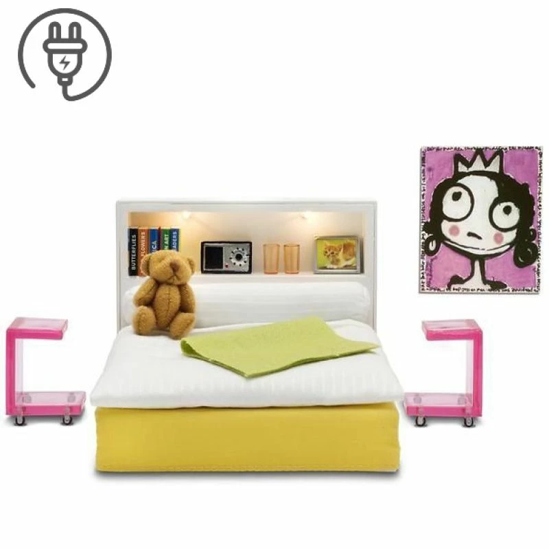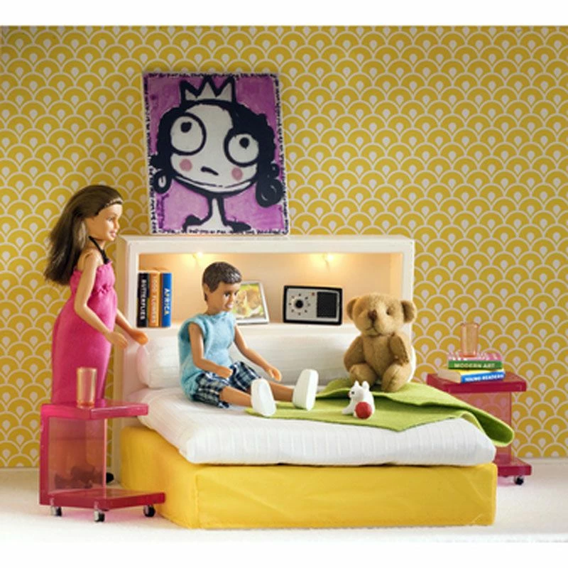 Flott, moderne seng som passer perfekt i Lundby Stockholm huset, med alt som trengs for en god natts søvn! Sengegavlen har hylle med lys og oppbevaringsmuligheter for det medfølgende tilbehøret, og de stilige nattbordene med hjul passer godt til den moderne stilen. Med i settet er også et flott maleri som kan henges på veggen (dukker ikke inkludert)