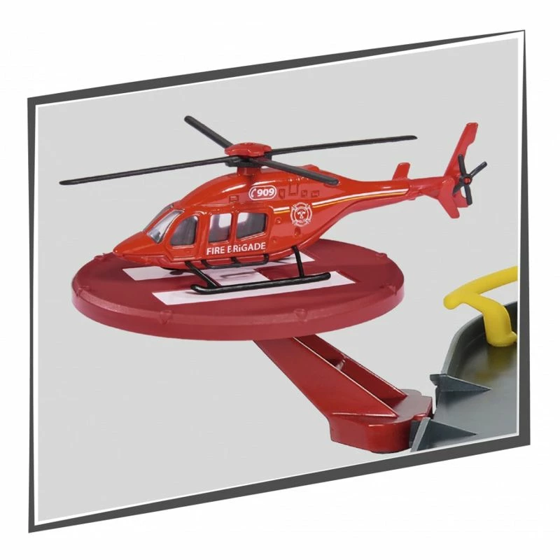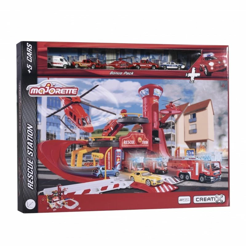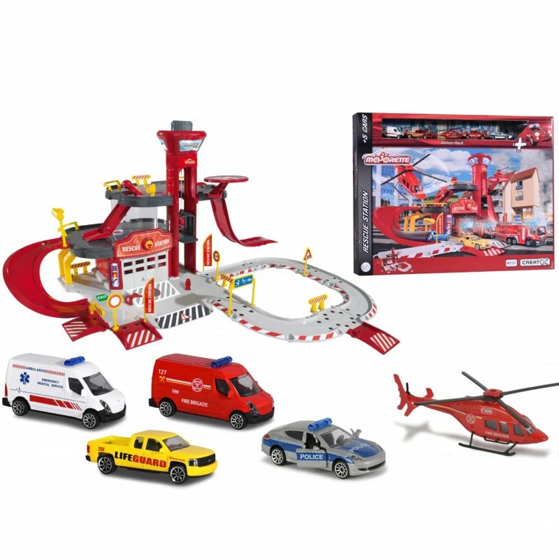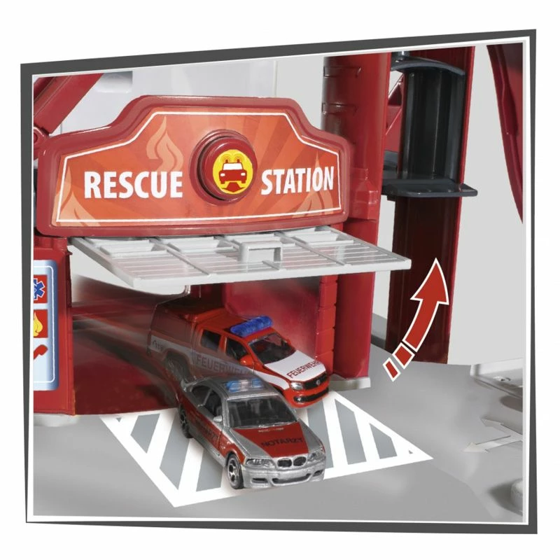 Den stilige Brannstasjonen fra Majorette gir deg hele 3 etasjer med morro! Bruk heisen for å frakte bilene opp til andre og tredje etasje og bruk rutsjebanene for å komme raskt ned igjen. Når bilene ikke er i bruk, kan du parkere inni garasjen. Helikopteret har en egen landeplass på det stilige lekesettet.