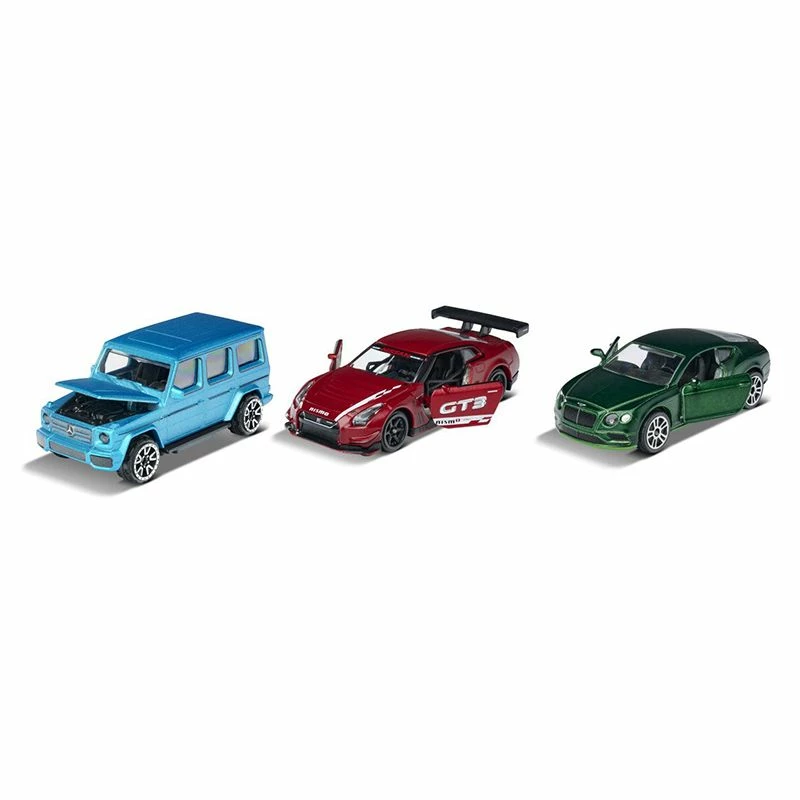 Limited Edition Majorette bilsett bestående av tre stilige biler: Bentley Continental GT VB S, Mercedes-Benz G 500, og Lamborghini Huracán Coupé.