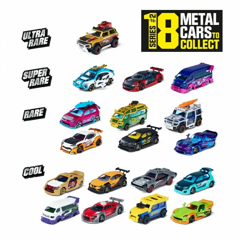 - Hver overraskelsespakke inneholder 4 av 18 samlerbiler.