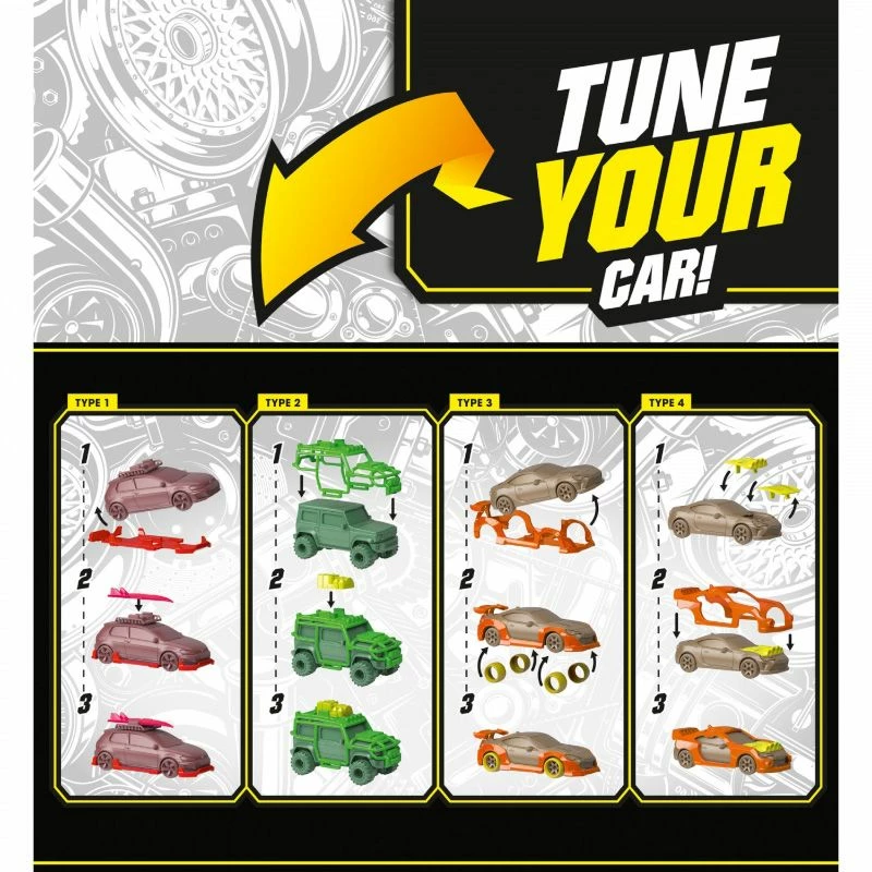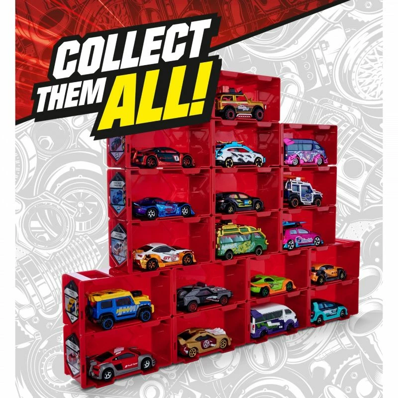 Det er også en samlebrikke for entusiastiske bilfans, som kan byttes med andre samlere. Hver samlerbrikke inneholder følgende attributter: terreng, fart og stil. Settet kommer også med et klistremerkeark og eksklusive komponenter som lar deg tilpasse modellbilsamlingen din med dine egne unike design. Still opp bilen og dra på et vilt eventyr! Det er også en stablebar oppbevaringsboks for å vise de finjusterte kreasjonene dine.