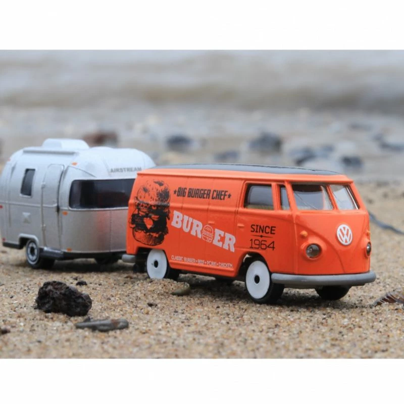 Klassisk VW T1 med Airstream Sport 16 campingvogn på hengeren i diecast metall. Bilen måler ca 7 cm og total lengde med vogn er 14 cm. Fra 3 år.