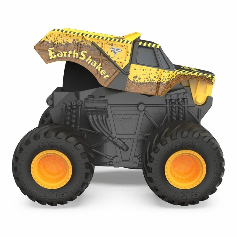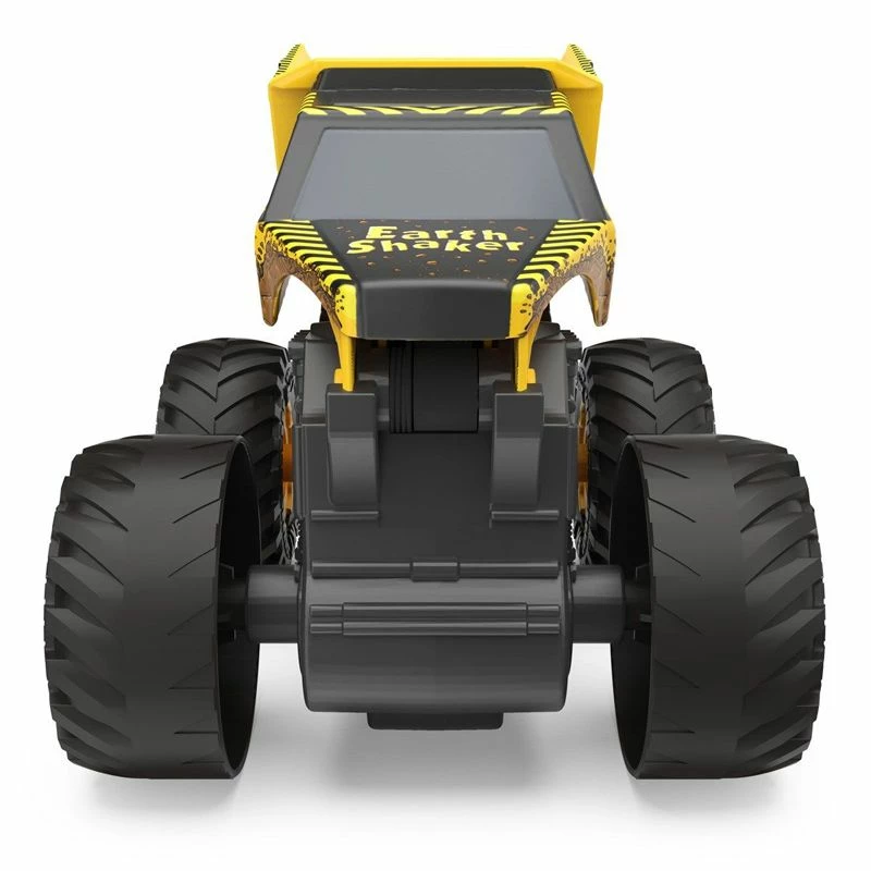 Monster Jam Click & Flip lar deg utføre tøffe saltoer med kjøretøyet ditt. Trykk baksiden av bilen nedover og slipp taket for å se at den kjører fremover av seg selv og utfører en imponerende salto! Den stilige Earth Shaker bilen kommer i en gul farge med sort og brune detaljer.