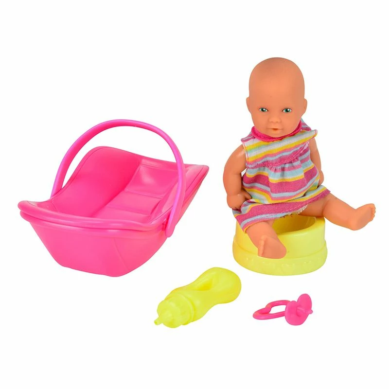 De søte New Born Baby dukkene kommer nå som minidukker! Hvert mini babydukke lekesett kommer med morsomt tilbehør til den lille babyen. Lekesettet kommer i 3 forskjellige versjoner med forskjellig tilbehør og blir plukket ut tilfeldig når du bestiller på nett. Det ene lekesettet består av en babydukke med rosa prikket kjole, en lekebil, en smokk, tissepotte, og en flaske. Det andre lekesettet består av en babydukke med et rosa antrekk, tissepotte, badekar, smokk, og flaske. Det tredje lekesettet består av en babydukke med enstripete kjole, sete, tissepotte, smokk, og flaske.