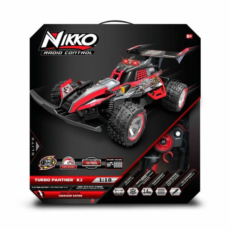 Stilig radiostyrt bil fra Nikko med tøffe detaljer og full styring! Bilen har en toppfart på hele 20 km/t og svinger til høyre og venstre, samt rygger. Bilen kjører på 2,40GHz frekvens med mulighet for at opp til 40 like biler kan kjøres samtidig uten å forstyrre hverandres signaler. Med rekkevidde på opp mot 50 meter er denne stilige røde Turbo Panther X2 perfekt til kappløp og lek! Den stilige kontrollen gjør det enkelt å styre og svinge mens bilen suser av gårde!