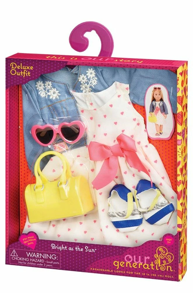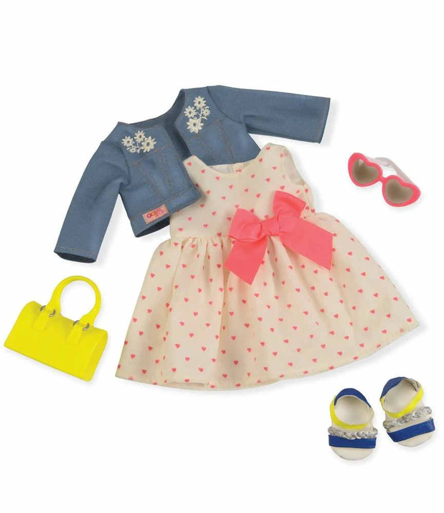 Kle opp din Our Generation dukke med dette flotte settet som inneholder sommerkjole med hjerter på, dongerijakke, solbriller, veske og sandaler. Passer alle Our Generation dukker. Passer fra 3 år+