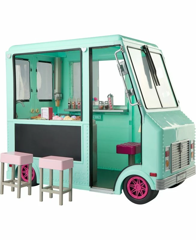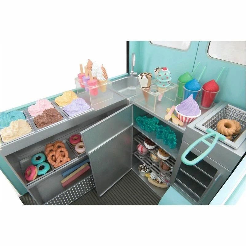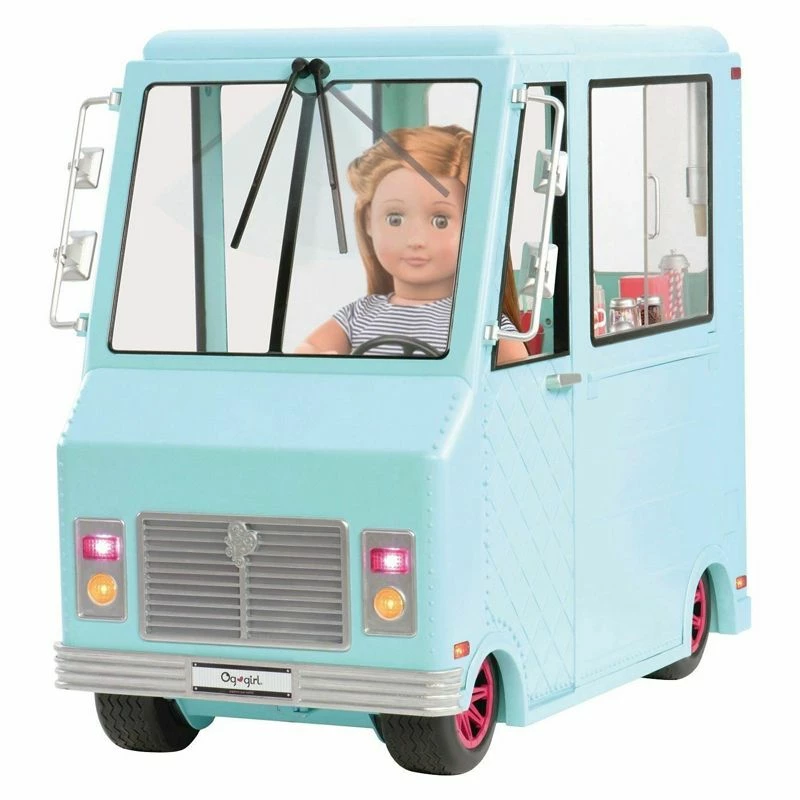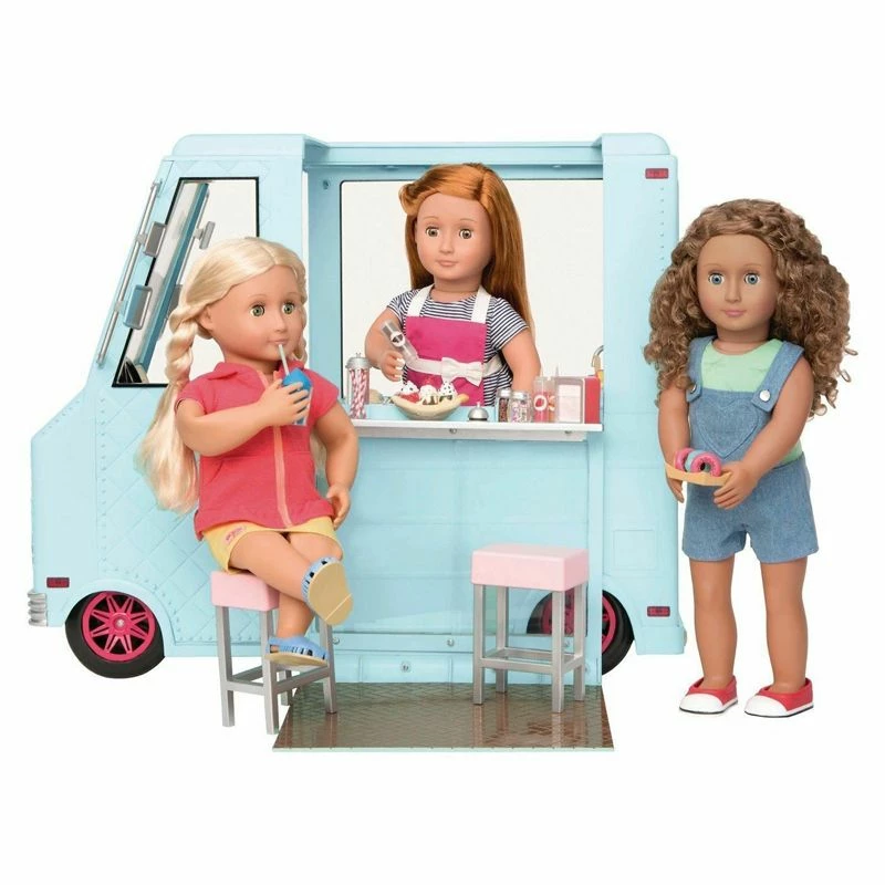 Lyden av sommer ville ikke vært komplett uten musikken fra en isbil! Denne kule Our Generation Sweet Stop Iskrembilen lyser opp, spiller søte melodier og har alle slags søte tilbehør! Med fargerike iskremer, realistiske smultringer, kringler og mye mer, vil Our Generation-dukken og vennene hennes garantert ha det godt i denne herlige søte iskrembilen! Dukker selges separat. Anbefalt alder fra 3 år.