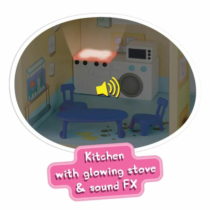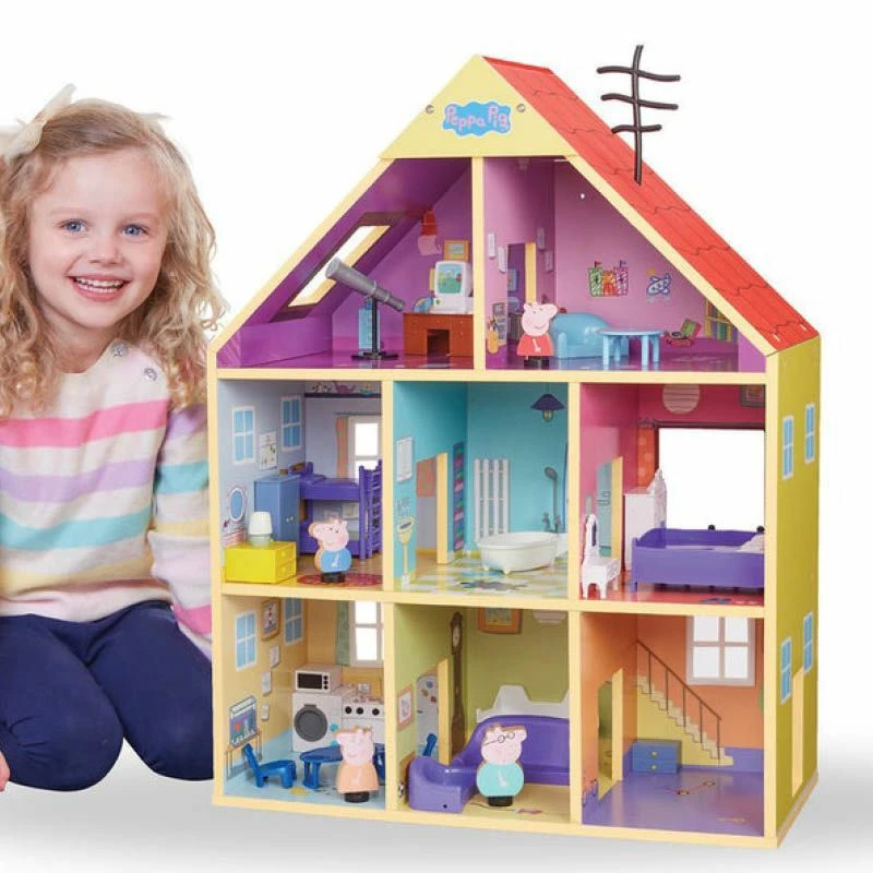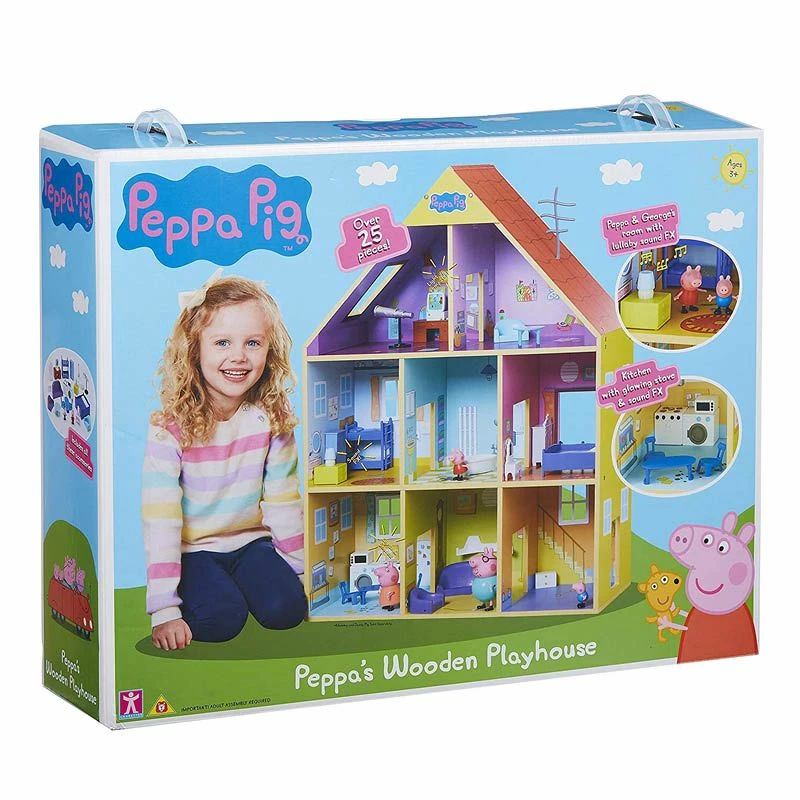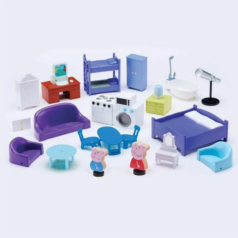 - Innhold: Peppa Gris lekehus i tre og 25 tilbehørsdeler og Peppa og George figurer