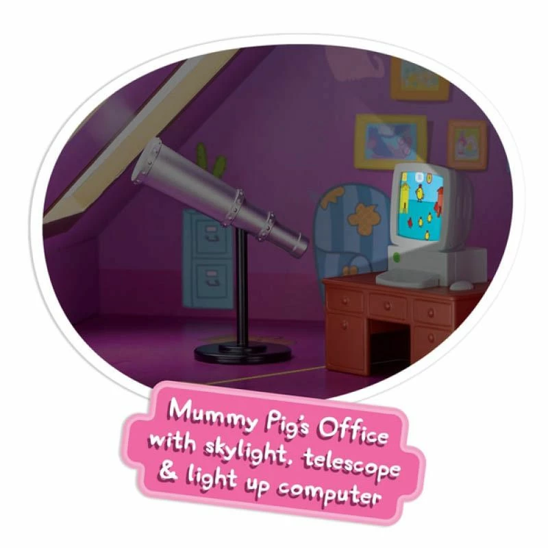 La barnet besøke Peppa og lillebroren George hver gang de leker med Peppa Pig Deluxe Wooden Playhouse for gryntastiske opplevelser! Det super morsomme lekesettet er rundt 65 cm høyt og 50 cm bredt med tre etasjer og åtte rom å utforske. Lekesettet inkluderer møbelutstyr som en opplyst datamaskin og et kjøkken komplett med interaktive lys og lyder for å inspirere barnet ditt til å gjenskape favorittscenene fra showet. Fra 3 år.