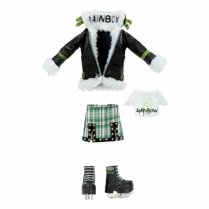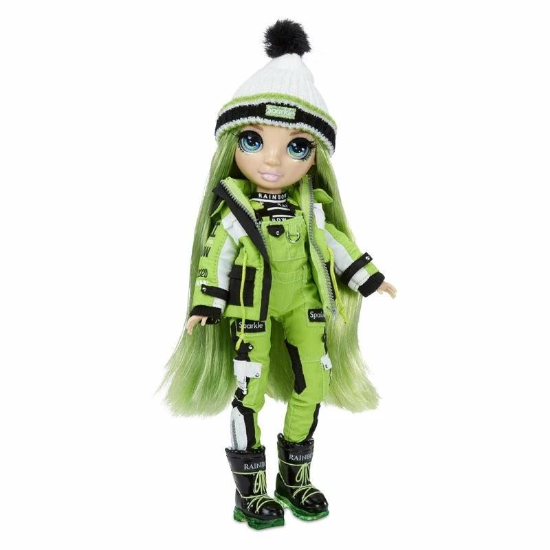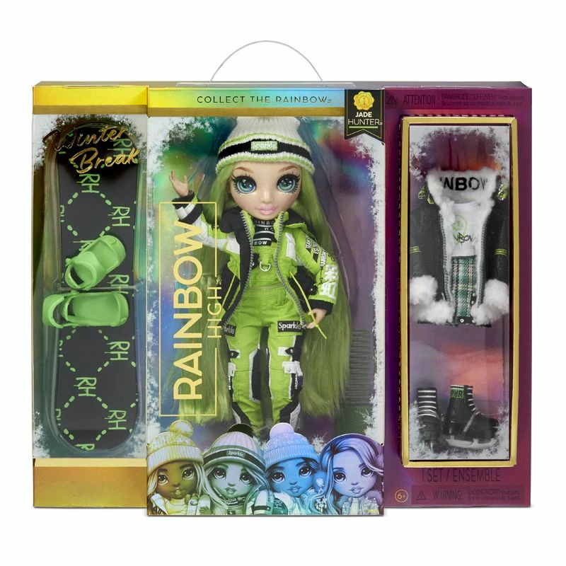 Samle på en regnbue av vakre motedukker fra Rainbow High Winter Break. Møt den flotte Jade Hunter. Hun er ikledd grønn fra topp til tå, og hun har et nydelige antrekk, lange øyevipper og vakkert, børstbart hår. Hun er fullt artikulert og poserbar. Armene og bena bøyer seg, slik at hun kan slå massevis av glamorøse positurer. Jade kommer med to komplette antrekk og et snowboard for å blande og matche for et stilig, showstoppende utseende som holder henne varm i skibakken.