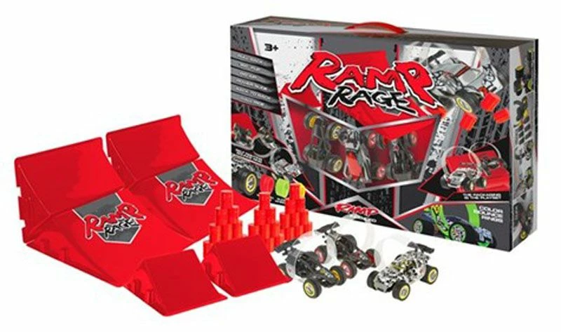 Wow! Imponer vennene dine med noen av de kuleste bilstuntene de aldri har sett før. Ramp Rage bilen har høy dreiemoment, tilbakeslag og en sprett-ring som gjør at bilen kan fullføre 360 graders løkker. Innpakningen er faktisk rampen. Det er 3 ulike typer ramper ,med to av hver,som du kan sette sammen på forskjellige måter. Du kan også endre dekk og bilen sin karosseri for å matche og finne den optimale typen for ditt stunt. Pakken inkluderer: – 3 komplette biler(9 og 10 cm lange) – 6 ramper – 30 tønner