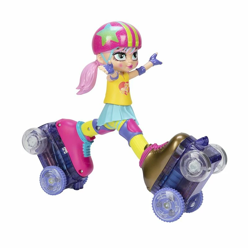 Nå kan barna dra på fartsfulle eventyr sammen med Rainbow Riley og se henne utføre fantastiske bevegelser. Ved å bruke den bomboksformede fjernkontrollen kan barna flytte Rainbow Riley forover og bakover, gjøre 360 spinn og til og med spagaten, alt mens de spiller musikk! Dessuten lyser hjulene på skøytene til Riley opp i forskjellige farger når de beveger seg for ekstra spenning! Bli med på rulleskøyte-moroa med Rainbow Riley!