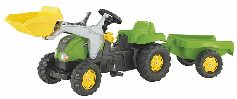 Tråkk av gårde på denne tøffe grønne tråtraktoren med skuff og henger. Små traktorentusiaster kan styre med rattet og løfte skuffen opp og ned med håndtaket for å grave i sanden eller løfte opp andre ting og som en kan ta med seg på turen. Perfekt for små barn som liker trøtraktorer.