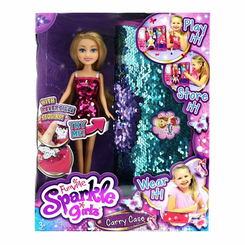 Ta med den flotte Sparle Girlz dukken på nye eventyr med dette stilige lekesettet. Dukken har flott blondt hår og en nydelig paljett kjole som kan veksles mellom å være rosa og sølv. Med den turkise vesken har du alltid en perfekt plass til å oppbevare ting med de praktiske lommene. Vesken er også dekket med glinsende paljetter og kan bli både turkis og lilla. Dukken måler ca 26 cm i høyden og kommer med bevegelige ledd.
