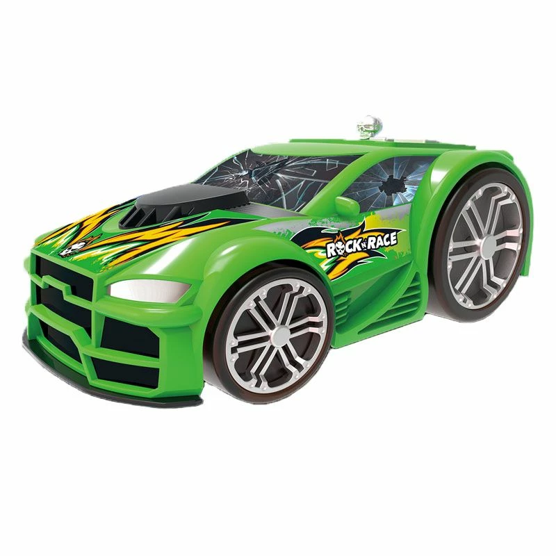 Denne stilige Rock N Race bilen kommer med tøffe lyd- og lyseffekter! Dytt giren som er plassert på taket på bilen fremover for å få bakhjulene til å spinne og lyse opp. Press ned på bremse knappene ved siden av giren for å få den til å stoppe.