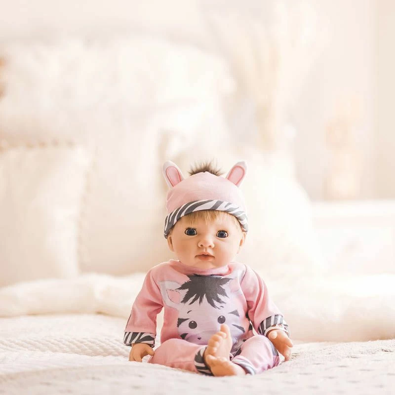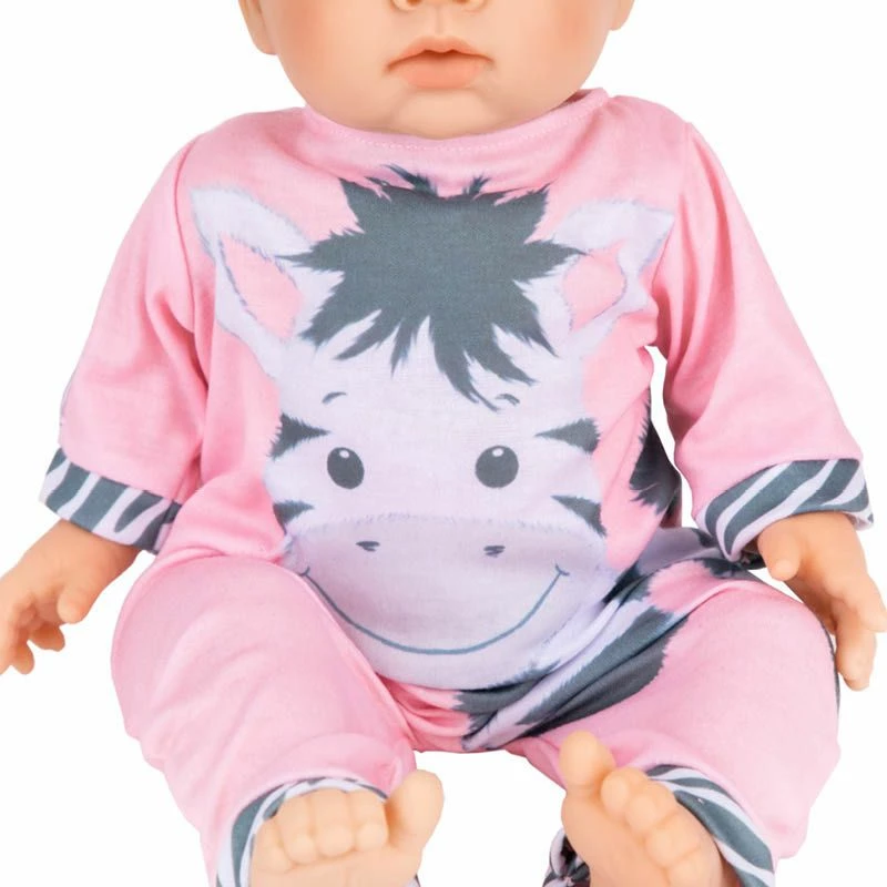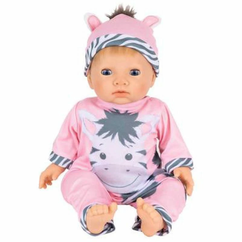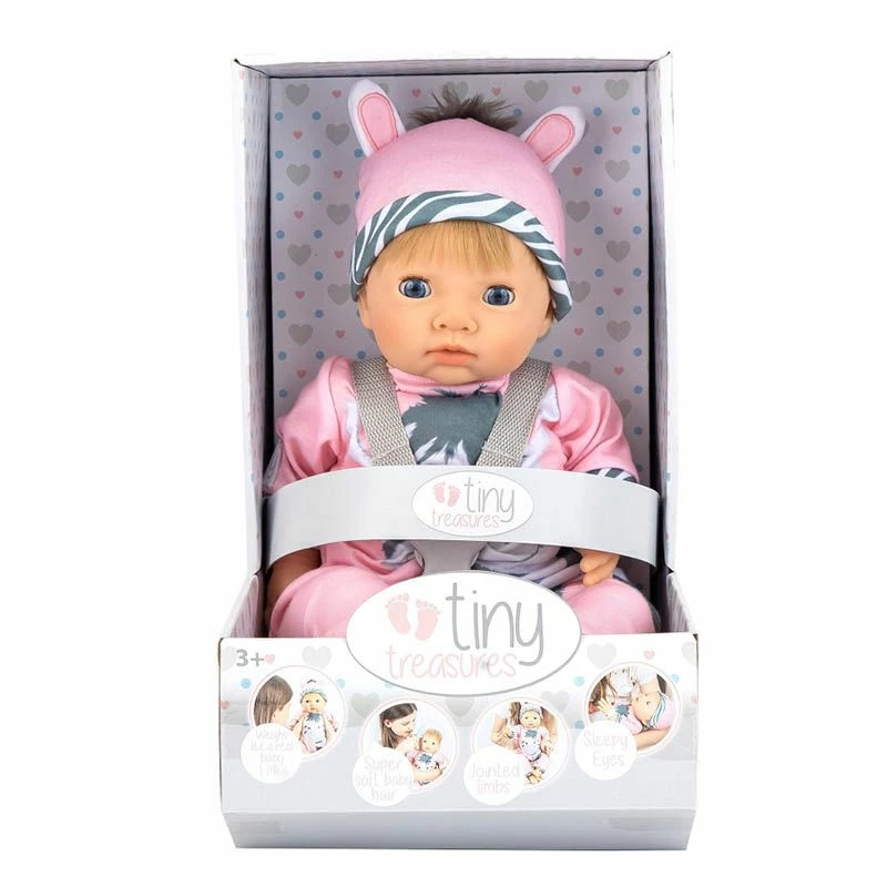 Tiny Treasures dukke med blondt hår og et søtt rosa sebraantrekk med matchende lue. Dukkenes øyne lukkes når den legges i søvn. TIny Treasures dukker veier mer enn andre dukker, så de føles akkurat som ekte babyer (dukkene veier 1255 g og måler 45 cm). Dukken kommer i en gaveeske med bilsete med ekte seler. Fra 3 år.