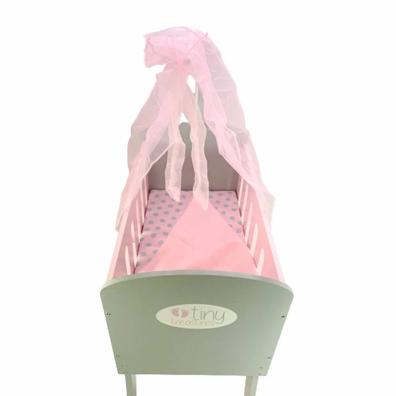 Søt seng til din Tiny Treasure dukke i går og rosa. Til sengen følger det med en madrass og et rosa teppe i fleece. Sengen måler ca 48x43x28 cm (LxHxB)
